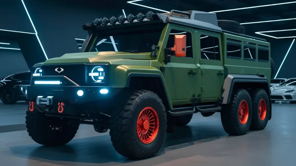 The first thing you notice about the Musso 6×6 is its commanding stance. With three axles and massive all-terrain tires, it looks ready to crawl over deserts, snowfields, and rocky mountain trails without hesitation. The extended wheelbase improves load stability, while the six-wheel layout delivers incredible traction on loose surfaces. This is the kind of truck that turns heads at overland expos and makes ordinary pickups look tame by comparison.